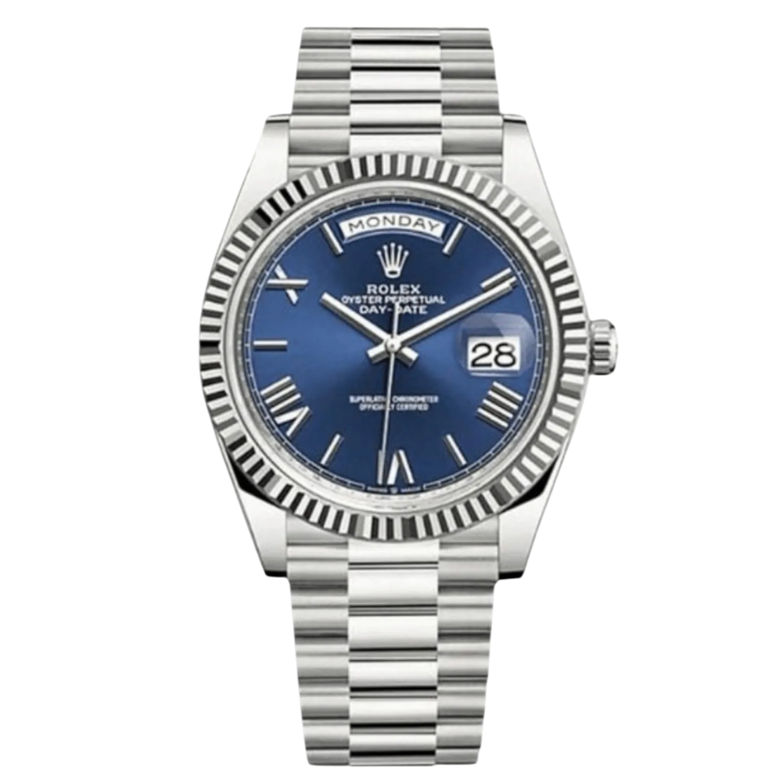 رولكس داي ديت ميرور مينا أزرق بسوار فضي بثقة وأناقة عصرية
